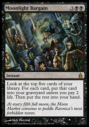 The next suite of cards are tutors and draw spells. Entomb and Intuition are insane in this deck, effectively [card Demonic Tutor]Demonic Tutors[/card] with upside. Similarly, Fact or Fiction and Moonlight Bargain are even better in this deck than normal. You get to dig five cards deep, keep all of them, and cast the best ones twice!