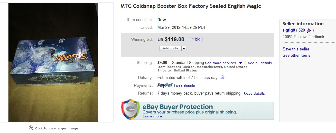 As you can imagine, this is a rare occurrence. Sometimes obscure items are best sold on eBay. For example, I recently sold a sealed Coldsnap Booster Box through eBay: