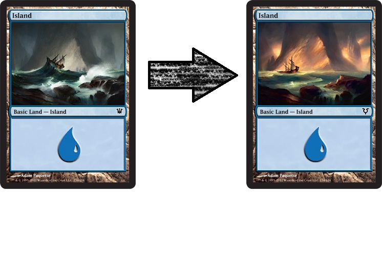 Redditor Sephiroth912 noticed something strange when he was looking at the visual spoiler for the basic lands in Avacyn restored.