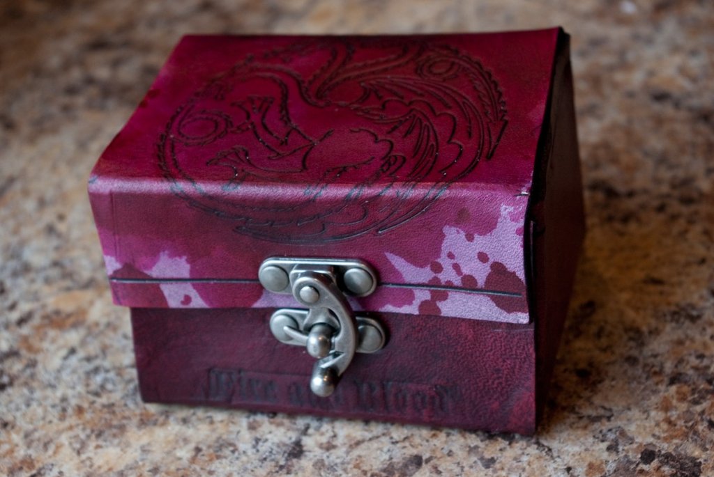 A functioning deckbox made from leather by his wife, Samantha who is a leatherworker. If you’re jealous of his cool swag, Samantha has an etsy page etsy.com/shop/TaeliacStudio and can make custom deckboxes to order. I’m waiting on a TARDIS deckbox myself. I see the appeal of a box that’s small enough to fit in your bag but is big enough on the inside for your entire collection.