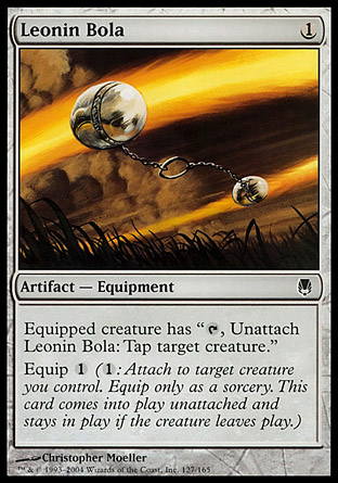 The fourth set of cards leverages cat tokens to control the board. Deathtouch equipment combined with Mortarpod gives you unconditional removal for two mana and a sacrificed token. Thornbite Staff costs more up front but gives you the same effect without requiring a sacrifice. Leonin Bola is a recent upgrade to Diversionary Tactics, a card that doesn't get nearly enough love in its own right.