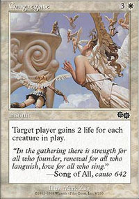 The way the game played out: I landed a Magus of the Moat (not Moat proper because Nate is a cheapskate) while Jens assembled an arbitrarily large combo. I don’t exactly recall the cards used, but what he did was generate infinite creatures that netted him one green mana and one life for every creature. Then he cast a Hurricane for all but one of his life total. This was lethal to the other players, but I casually flicked a Congregate onto the table.