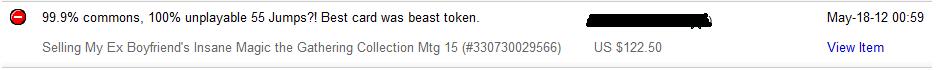 Drunk on the idea of finally getting one of those dream boxes filled with goodies, people put up massive amounts of money for unseen cards. The scammers depend on this. They fill those boxes with trashy commons. They fall back on "I had no idea what was in there anyway!" They play you because they get an eBay account with no Magic purchases in the feedback history. This can be one they created or just got from a friend - a friend who will take a few negative feedback ratings to make a couple hundred dollars in the exchange.