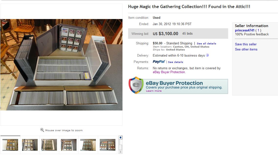 This shouldn't scare you off of buying collections on eBay, but it should educate you about the warning signs to notice. I suggest sticking to buying collections of rares that are listed and photographed; that don't have phony 'found in closet' stories attached; and that are valued at about what you'd pay for the listed cards, anyway. I invite people who have had successful and intelligent collection purchases on eBay to let me know what your experience was like in the comments section below!
