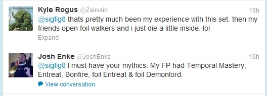 When odds are increased, and you are looking for simple commons and uncommons from a given set, opening such poor fodder is an even more fateful dagger. My message to Wizards and the broader Magic community: until this dichotomy is removed, I vow not to open another sealed pack of Magic outside of Limited tournament events. Who is with me?