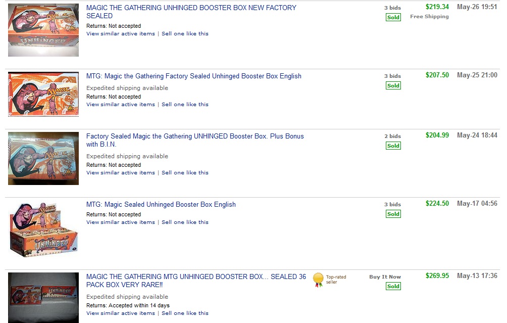 Lastly, we could try to brainstorm other Magic products which are highly collectible, rare, and should maintain value even should the game of Magic lose popularity. Many of you already know I have a sizable investment in sealed Magic Booster Boxes. I feel these should not drop in value because they will assuredly decrease in supply while a sufficient casual market will maintain a sizable demand. There is no need for a Star City Games tournament circuit for a sealed Unhigned Booster Box to grow in value.