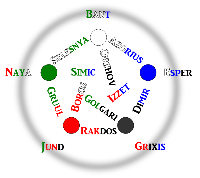 Redditor "tastyclown" starts us off this week with a handy chart of the color alignments of recent 2 and 3 color guilds/shards. If this were 3 dimensional, the Z axis could conceivably show the 3 color guilds (ana, raka, dega, etc.) from Apocalypse.