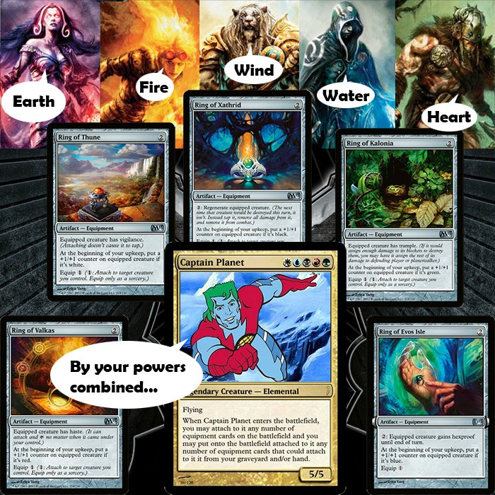 Joystick_Genie was reminded of another cycle of colored power rings from his childhood. I personally think if you get all five rings on five creatures of the appropriate colors it should summon Keeper of Progenitus. After all, Keeper of Progenitus is a hero. Gonna take their life down to 0. Right? Like in the song? Ok, then, moving on.
