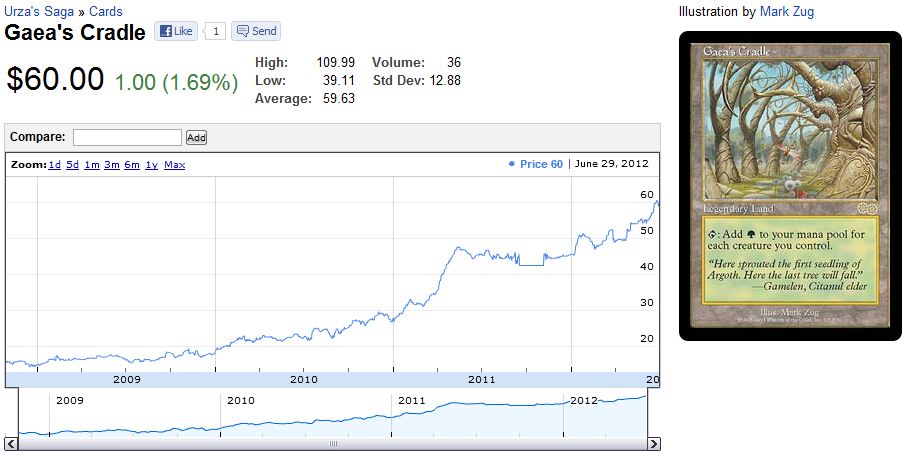 Let me therefore propose a slightly alternate approach. Identify the cards in your collection to which you are emotionally attached. If you’ve always wanted a Gaeas Cradle, it’s perfectly fine to sink the $60 it would take to acquire the card right now. Need the latest Angel card to keep your collection complete? Pre-ordering the card from Star City Games may be costly, but it’s reliable and instantly gratifies.