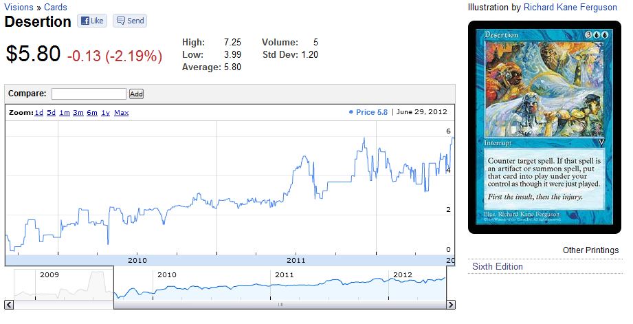 Funny enough, thanks to EDH Desertion is once again a $5+ card and a fairly stable pick-up at that. The card is easy to grab in trades and even buy-lists to retailers well (chart courtesy of blacklotusproject.com)