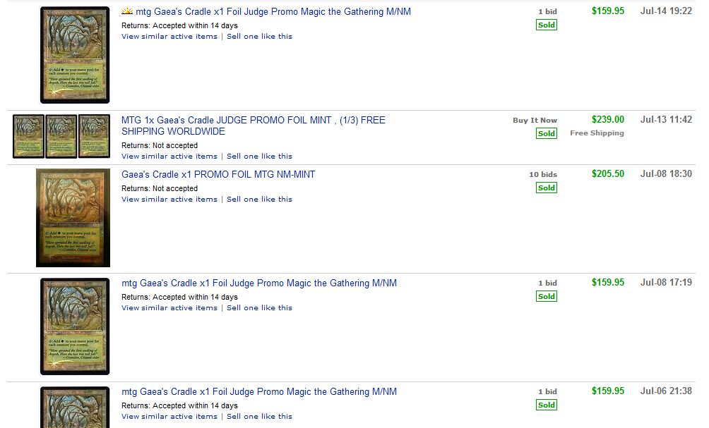 This type of predictably irrational behavior can enable you to influence trades significantly. If you saw one of these Promo Gaeas Cradles in someone’s trade binder and they were unsure how to value it, you should theoretically show them these eBay completed listings first. You could say “well, at auction these have been selling for $160, so I can value it at $180 in trade”. If you looked up only active listings, your trade partner may be inclined to say “well, there’s only one left on eBay at $239, so I’d like a value around there”.