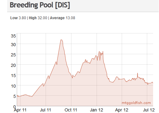 The chart for Breeding Pool shows a strong spike during the speculative frenzy that came with the announcement of the Modern format and then a drop followed by a rise and a secondary peak during last yearâs Modern season. For this card, the actual playability of it in Modern matters little as the herd behavior of speculators and the scarce supply will inevitably combine to form a new price spike. Keep your eye on this card or get in now at the Modern era price floor of 10-11 tix, then sell into the market at or near the start of the PTQ season when prices will have risen.