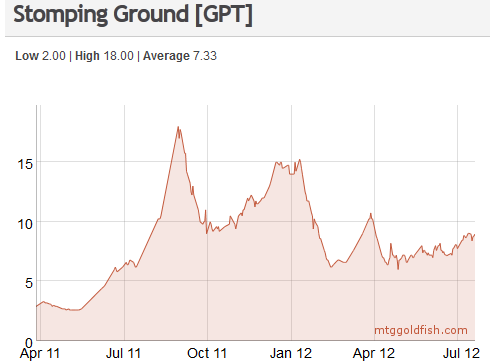 Stomping Ground and Godless Shrine both have similar charts as compared to Breeding Pool, but with less pronounced peaks and lower price floors as one would expect from more plentiful rares. These cards appear in more decks than Breeding Pool, but not in great numbers. Stomping Ground is usually a one or a two of in Jund and Zoo decks, and Godless Shrine makes the occasional appearance in token strategies and Doran decks. Nevertheless, expect price increases to happen for both come November and December.