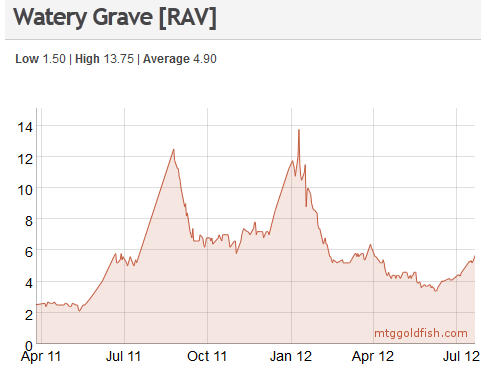 As for the two other guilds appearing in Gatecrash, Dimir and Boros, their respective Shocklands represent riskier bets, so avoid these despite their lower absolute prices. The risk comes from the high amount of supply of Sacred Foundry and Watery Grave in the market, so price moves will be muted in comparison to Breeding Pool, Stomping Ground and Godless Shrine. If you had caught them at their Spring low, then you could have held for a small profit with little risk, but at this point they have risen in price such that the risk outweighs the potential gains.