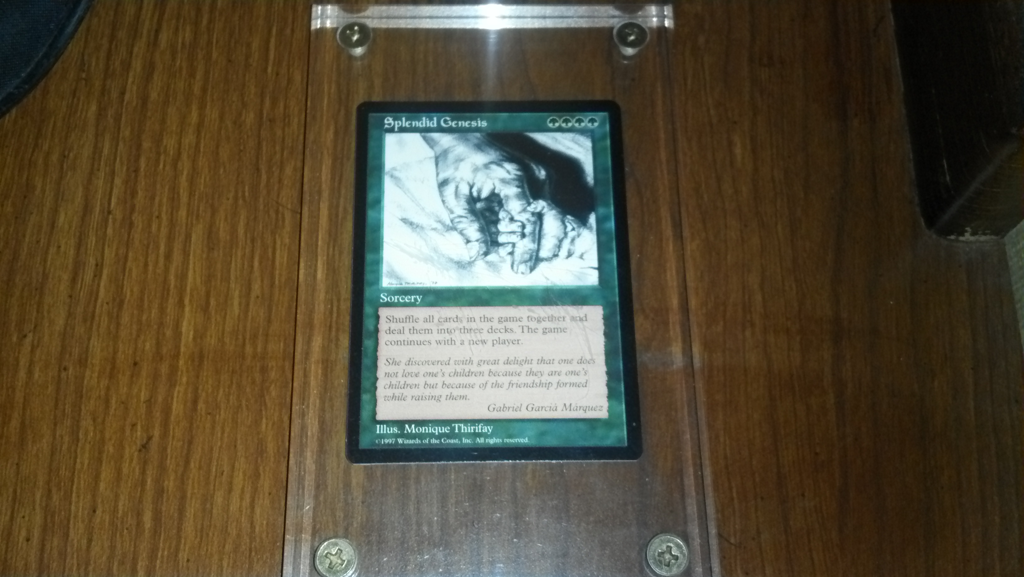 Recently I got to bear witness to a transaction that involved moving a copy of "Splendid Genesis" to the winner of a private auction. For those who don't know what exactly "Splendid Genesis" is, there is a Magic Wiki online that offers next to no help.