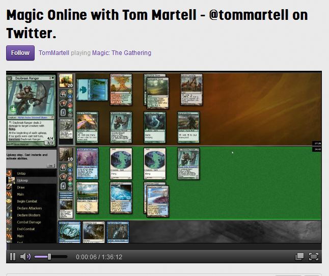 Twitch – www.twitch.tv – is a recent discovery of mine. Through this website, I am able to watch some of the better Magic players duel it out on MTGO live without leaving my home. It’s like I’m looking over their shoulders as they sling their spells and battle for some free digital packs.