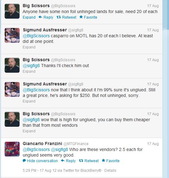 For example, here’s a recent conversation I had on Twitter discussing recent pricing trends on Unhinged & Unglued basic lands: