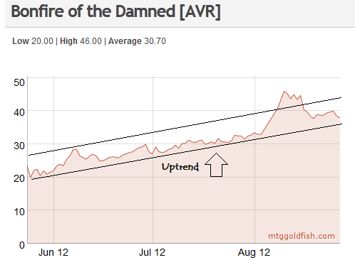 Bonfire of the Damned has been taking a breather in the 38-40 tix range after it shot up to 43-45 tix in recent weeks. There's no indication that sentiment or supply has meaningfully changed for this card. With Standard being in a lull right now, Bonfire is set to run to 50 tix once October hits. Try to pick off copies for 37 or 38 tix on the classifieds by scanning for players selling their lone copies or posting a buy ad.