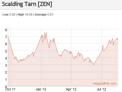 Scalding Tarn is the most played and typically the highest priced of the Zendikar fetch lands. It saw prices of 4 to 7 tix during the most recent Modern PTQ season. Although the next season was 6+ months away, there was no reason to expect these prices to stick around.