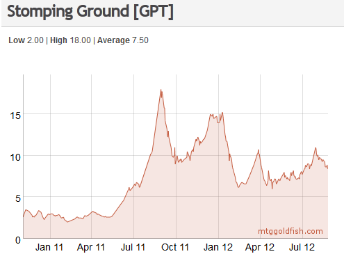 On the other hand, both Stomping Ground and Godless Shrine have fallen in price and are now in the 9 to 10 tix range. Keep your eyes on these over the next two months. If they creep down into the 7 to 9 tix range, those are good prices and both will yield profits leading up to the Modern PTQ season.