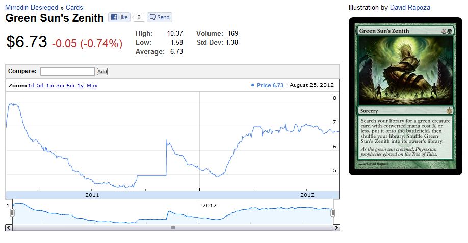 Finally, there are a few smaller cards worth considering for long term acquisitions. The one I want to highlight here is Green Sun's Zenith – a powerful card maintaining a consistent price tag despite appearing in an Event Deck (chart from blacklotusproject.com). It probably won’t be too difficult to trade fresh Return to Ravnica cards for these Zeniths at around $6, which is nearly equivalent to converting your overpriced RtR cards for cash.