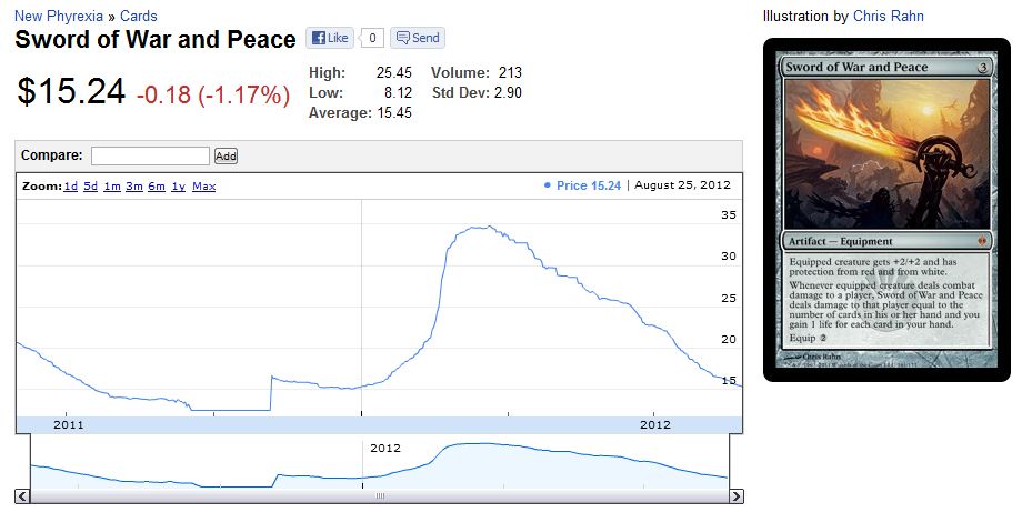 There are a handful of cards to consider acquiring soon from Scars block. The first cards that come to mind are the swords. Each of them are near their all time lows, but their playability in EDH and Legacy make them viable pick-ups in the near future (chart from blacklotusproject.com).