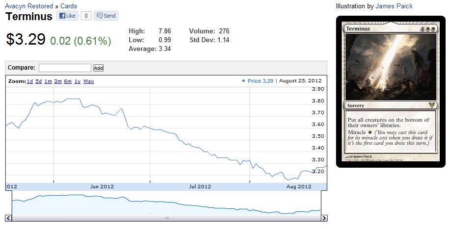 I have also been recently touting the miracles of Avacyn Restored. While everyone knows Bonfire of the Damned is on the rise, cards like Terminus and Temporal Mastery may deserve a second look (chart from blacklotusproject.com).