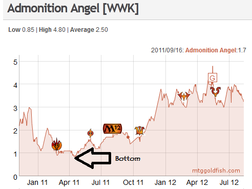 As good speculators, this means that over the next few months, target only Eternal staples and mythics. Here are some examples from last year showing when a few mythics bottomed out in price.