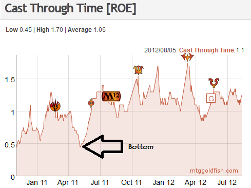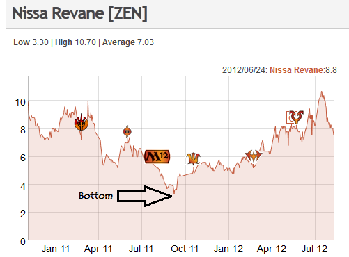 This chart is more typical of a junk mythic, and the bottom occurs much earlier in the year in mid-April. Once again, though, if you had bought during Innistrad release events, you still would have enjoyed a tidy profit by the turn of the calendar year.