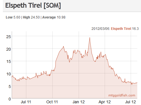 This card has powered up Delver variants in Standard as well as Birthing Pod decks in Modern. This card is a staple for both formats. The price has settled into a range of between 6 and 8 tix lately, but we can expect a small dip in price during M13 release events. The start of the Modern PTQ season in January 2013 offers downside protection on this position -- if the price remains stable or falls once rotation hits, then higher demand during the PTQ season should provide the best opportunity to exit this trade.