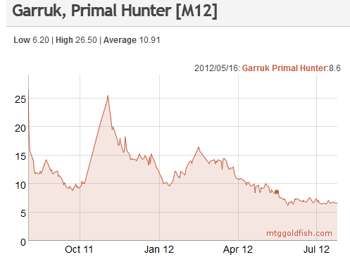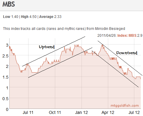 Looking over historical price trends, one notices that the price bottom for the cards from Mirrodin Besieged (MBS), as represented in the MTGGoldfish chart of the MBS index, is the end of July 2011. New Phyrexia (NPH) has a similar chart. That last week of July coincided with M12 release events, a time when prizes for sealed events are quite generous.