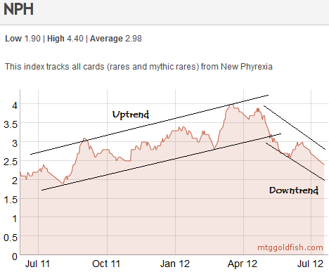 After the upward trend is broken, both MBS and NPH begin a downtrend where a series of lower highs and lower lows are reached. This downtrend is ongoing at the moment, as players eye the Fall rotation. It will continue until approximately October, when Scars block and M12 rotate out of Standard.