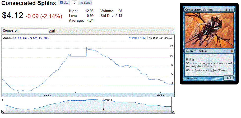 Consecrated Sphinx saw his day in Standard as part of the grindiest control deck to see play in quite some time (U/B Drownyard). Since the printing of Cavern of Souls, control decks have all but disappeared, and cards like Consecrated Sphinx donāt hold up well against Vapor Snag. Now found at some retail stores for $4, I think itās a good buy.