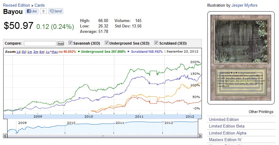 It seems that in winter 2010/2011 and again in spring 2012, Bayou missed out on a rally that some other Dual Lands participated in. Much like the gold/silver ratio inevitably returns to a mean, I feel the Underground Sea/Bayou and Scrubland/Bayou ratio should also revert back to its mean.