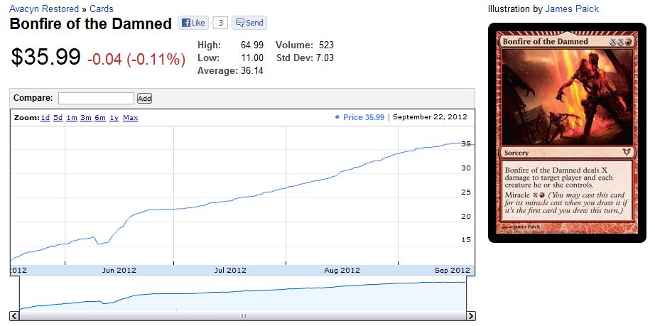Bonfire of the Damned got a lot of attention during its spike. But since Return to Ravnica spoilers began, I haven’t heard much about this card. Yet it’s still selling for $35 at auction! Like Falkenrath Aristocrat, this Mythic Rare is also from an underdrafted set. But I am more confident that selling Bonfire now is a good move versus the Vampire.