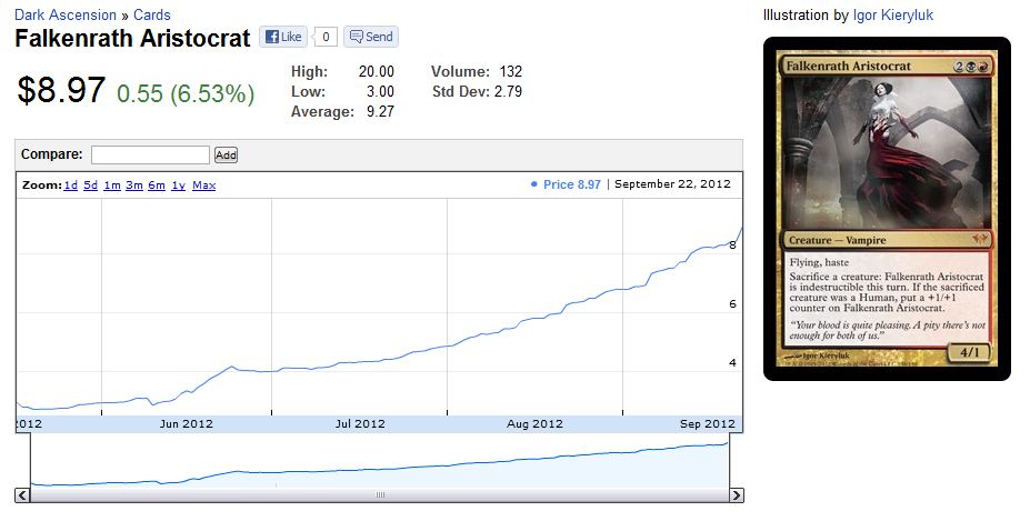 Blacklotusproject.com has had difficulty keeping up with another card’s price jump: Falkenrath Aristocrat