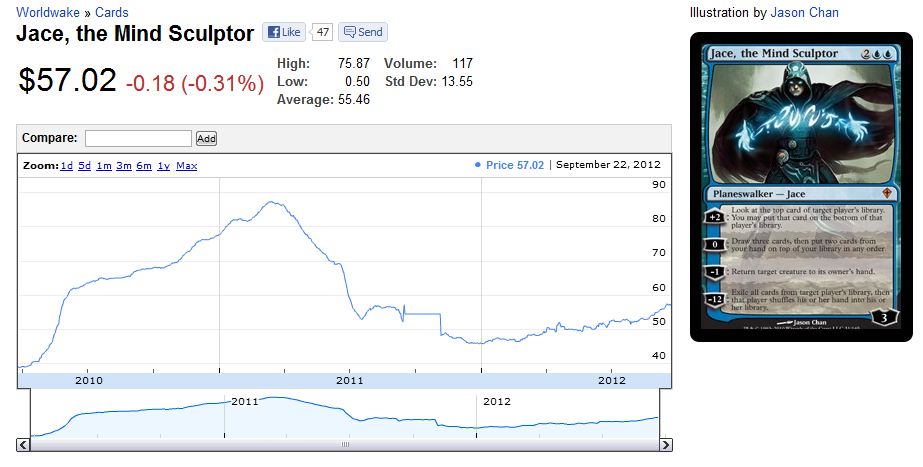 Lastly, I want to mention a card which, barring a major reprint in a Dual Deck, is destined never to drop in price again. Of course I am referring to Jace, the Mind Sculptor (chart from blacklotusproject.com).