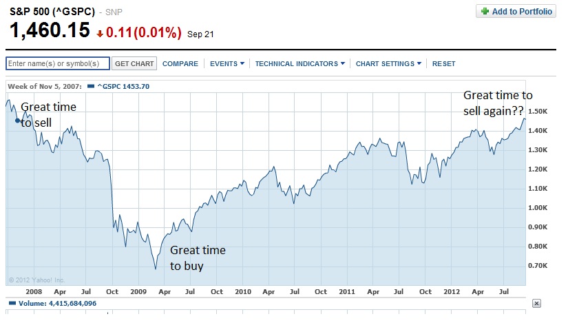 It’s actually quite similar to the stock market – I always strive to sell during market rallies and buy while everyone else is paranoid. This requires nerves of steel at times, since it’s difficult to dump tons of money into an asset that is shrinking by the day. But if you have confidence that the market will once again hit new highs, you should rest assured that your stock will be safe as long as you’ve purchased shares in a strong company (chart from Yahoo Finance).