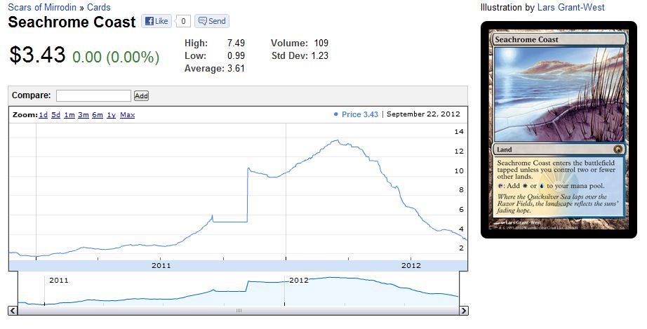 Although it’s been mentioned before, I want to emphasize how cheap Scars of Mirrodin Fastlands are right now (chart from blacklotusproject.com):