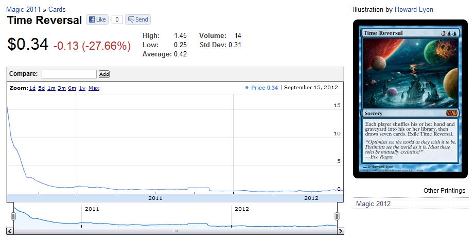 Another example is with Time Reversal, which sold for $29.99 upon initial spoiling simply due to the association with [card Timetwister]Power 9[/card]. Itās the same reason nearly every new Planeswalker is way overpriced during preorder season ā emotional responses of buyers due to a potential subconscious association with Jace, the Mind Sculptor.