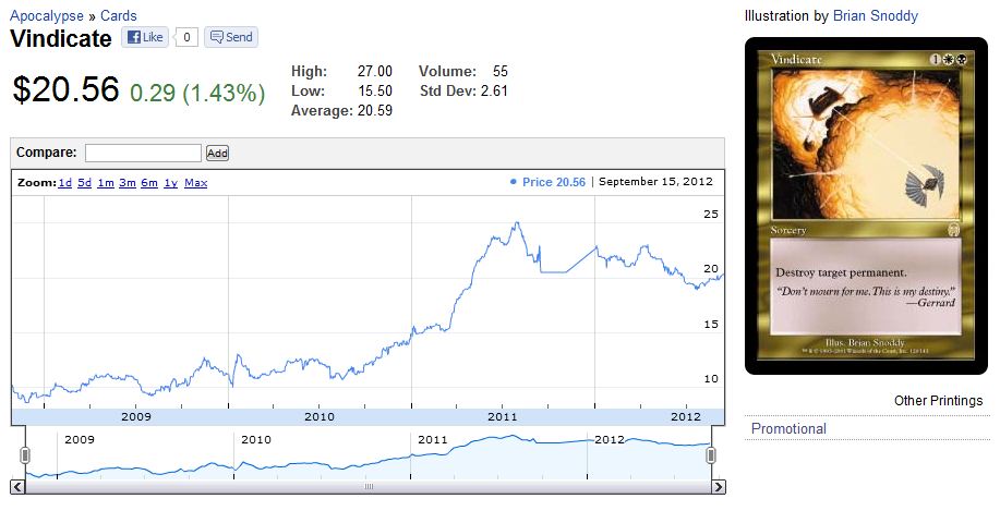 Next, people will compare the card to Vindicate, identifying how that card is now worth over $20 thanks to Legacy. What they neglect to notice, however, is that the card was worth half that for years (chart from blacklotusproject.com), not to mention the fact that Apocalypse didnāt sell on the same order of magnitude as Return to Ravnica will. Additionally, Abrupt Decay is a Rare in the Mythic Rare era.