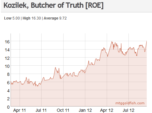 Kozilek and many of the other Rise of the Eldrazi (RoE) mythics have seen steady increases in their prices since they rotated out of Standard. New Phryexia compares well to RoE as both are 3rd sets and both have a number of powerful cards and large monsters such as the praetors and the chancellors.