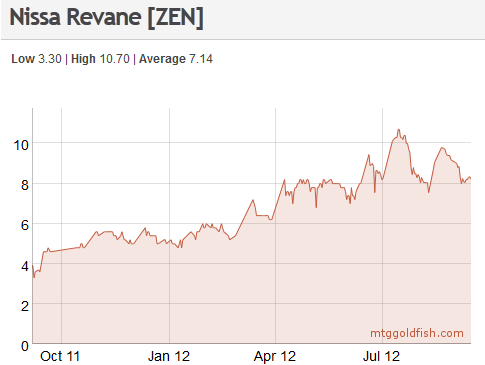 Many players have already anticipated this loss of playability. Sword of War and Peace has been on a rapid decline since the end of June. For speculators though, the absolute best time to buy up cards is approaching. Cards that were Standard staples from Scars block and M12 will soon be on sale as players sell their copies for whatever they can get. Eternal formats have been picking up lately online, but most players still play Standard or draft. And in order to draft, players need packs and tix, and when cards can't be played in Standard anymore, they quickly get sold into the market.