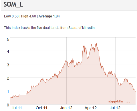 The bottom for these was the first week after Innistrad release events started. Although these three fetch lands are definitely lower tier, the recent interest in Legacy and Classic has driven up prices on all fetch lands. It took close to twelve months, but buying in last year on these lands would have yielded a nice profit at this point.