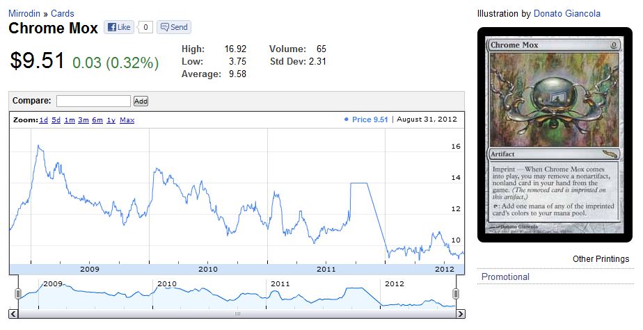 A recent example of a card like this is Chrome Mox (chart from blacklotusproject.com).