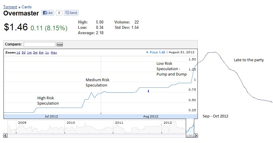 Finally, right before the huge spike is the pump and dump zone. This is where many speculators buy out eBay and TCG Player, driving the price up to a ridiculous high only to sell them right away. At this stage, finding a copy of Overmaster below $1 was the easiest way to make money since the card was already selling for over $2 on eBay. As long as you are thorough in your search to ensure you are paying less than auction prices, there really is a low degree of risk here.