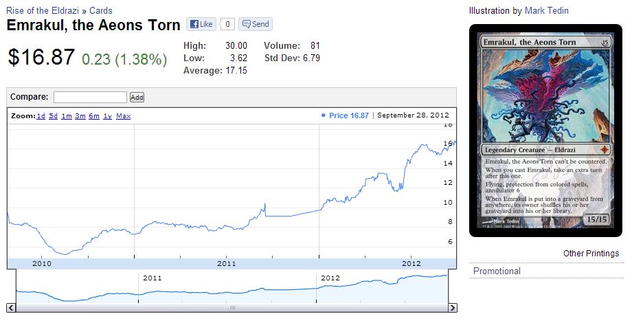 But what if the trade involves many cards? Iāve been in scenarios before where my trade partner and I were exchanging piles of cards. And when I ask him for a value on his Emrakul, the Aeons Torn and neither of us are confident in how much this card has increased in price recently, we get out the phone and look it up (chart courtesy of blacklotusproject.com).