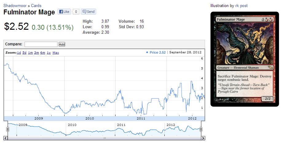 Letās say you have a sudden inspiration to speculate on Fulminator Mage because of the unbanning of Valakut, the Molten Pinnacle in Modern. Youāve done all the right research, considered the cardās price history (chart from blacklotusproject.com), and youāre ready to pull the trigger. Since the card is only $2-$3 and it once exceeded $5, there is certainly potential upside should Valakut become a Tier 1 deck in Modern.