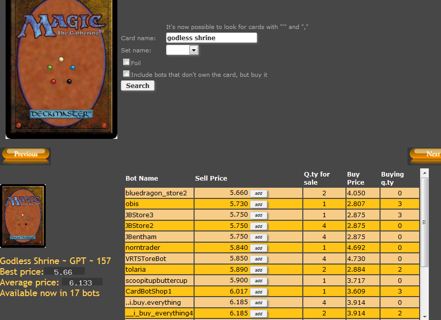 Browse thousands of prices with the first and most comprehensive MTG Finance tool around.