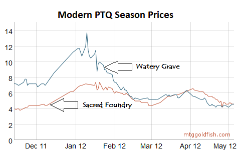 Sacred Foundry is used in Zoo and Boros, which means it will rise from the 5-6 tix range where it is currently to the 6-7 tix range. In the past Watery Grave has seen much higher in-season prices than Sacred Foundry, though right now it's not as widely played in Modern. It typically appears as a one-of in U/W decks to enable Lingering Souls or Unburial Rites. (You can check out the latest Modern deck lists from MTGO on the mothership.)